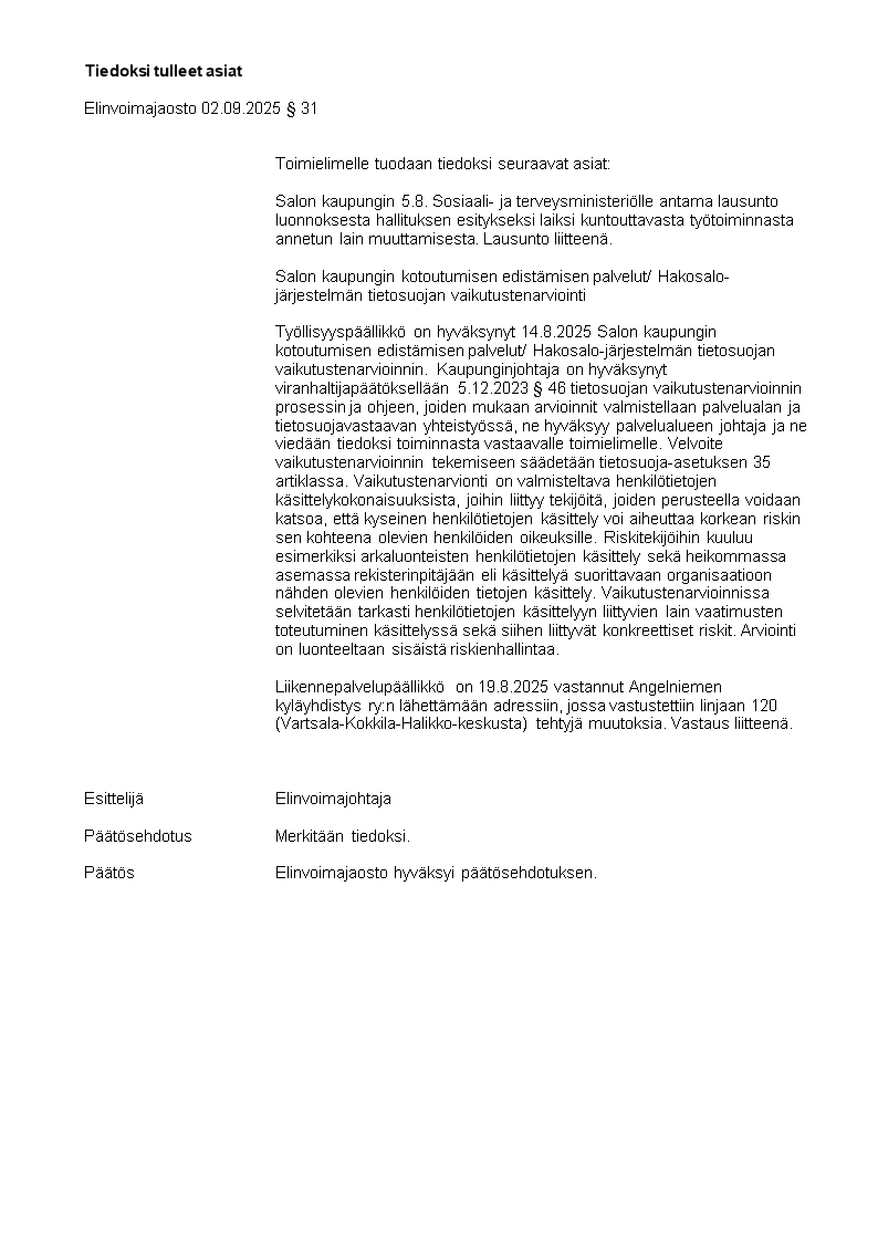 Pöytäkirja 02.09.2025/Pykälä 31