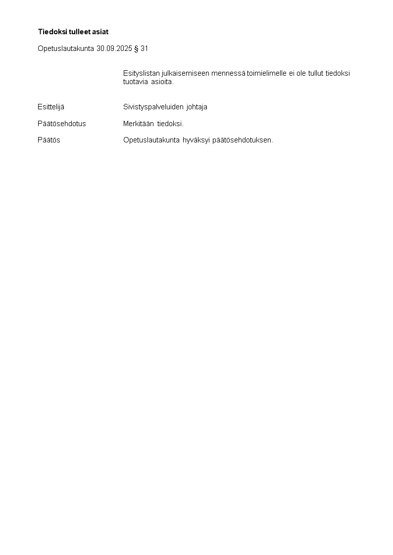 Pöytäkirja 30.09.2025/Pykälä 31